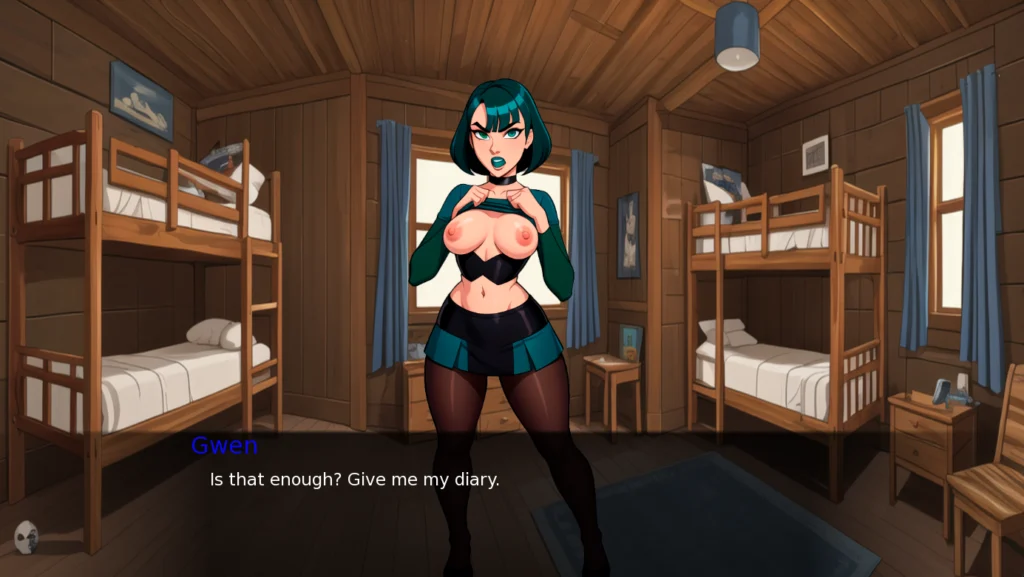 V0.2Alpha -Nuevo fondo del menú de inicio. -Se ha añadido una escena de sexo oral con Gwen. -Se ha añadido una escena de espionaje con Heather. -Se ha añadido una nueva escena y un nuevo argumento para avanzar con Raven. -Se ha añadido Bridgette al mundo de Total Drama. -Se ha añadido Starfire al mundo DC. -Se ha rehecho la apariencia de Gwen en varias partes. -Se han reescrito algunos diálogos. -Se han añadido varios diálogos.