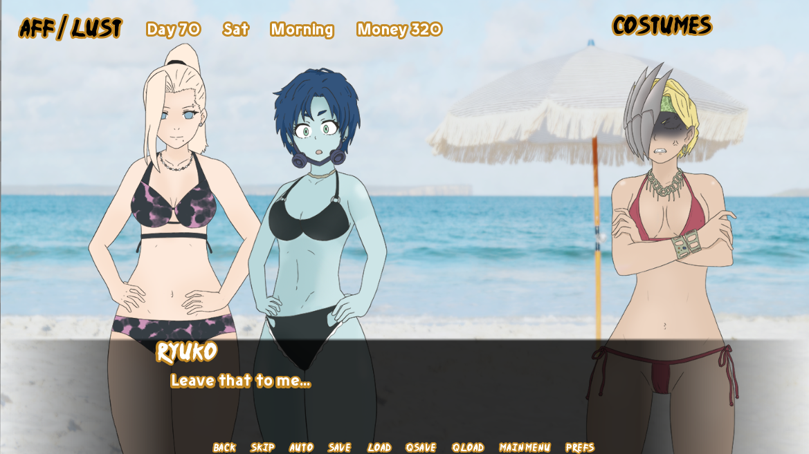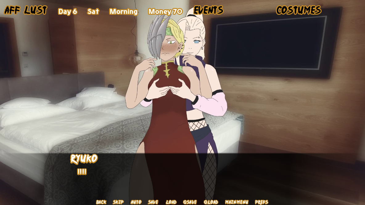 v0.7.2 1 nueva cita con Yamato (evento no apto para el trabajo) 1 nuevo evento de encuentro íntimo a medianoche (evento no apto para el trabajo) Se completaron todas las variantes del evento de cachetadas para Ryuko y Kaoruko (se añadieron trajes de baño, sudadera, bikini 2 y microbikini) Evento de ducha con Amy Evento de ducha con Gwen 3 nuevos eventos de limpieza para Ryuko (mientras sea novia o amiga con derechos) 3 nuevos eventos de limpieza para Kaoruko (mientras sea novia o amiga con derechos) Se añadió una protogalería para Ryuko (se ampliará en las próximas actualizaciones) Muchas correcciones de errores (citas con cuervos, sacar a Gwen y Amy de las salas VIP, gacha premium) Algunas correcciones tipográficas Se corrigió un error que impedía acceder a las opciones románticas de Sakura Se corrigió un error del antiguo evento de encuentro íntimo a medianoche