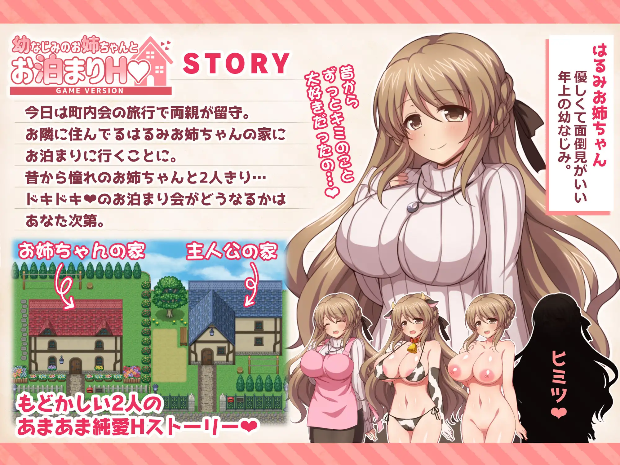 Mis padres están hoy de viaje a la asociación de vecinos. Decidí pasar la noche en la casa de Harumi, que vive al lado. A solas con la hermana mayor que siempre he admirado… El resultado de tu emocionante fiesta de pijamas depende de ti.