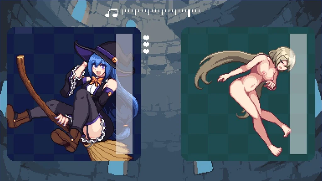 Bonitas y sexys brujas luchan entre sí en este singular combo de juego de ritmo y rompecabezas. Deja caer bloques al ritmo para derrotar y desnudar a tus enemigas. Disfruta de un poco de diversión ecchi mientras eliminas filas de bloques y te atascas al ritmo de las melodías en este satisfactorio juego de rompecabezas. En un mundo donde la magia se ha desarrollado en lugar de la tecnología, diez encantadoras brujas viven juntas en una gran torre para estudiar y hacer crecer sus conocimientos místicos. Sin embargo, los problemas surgen cuando una fuerza misteriosa toma el control de sus cuerpos y las obliga a intentar desnudarse unas a otras. Aunque al principio se cree que se trata de una broma, estas travesuras llaman la atención de un invitado inesperado, y pronto se hace evidente que hay fuerzas mucho más poderosas en el trabajo.
